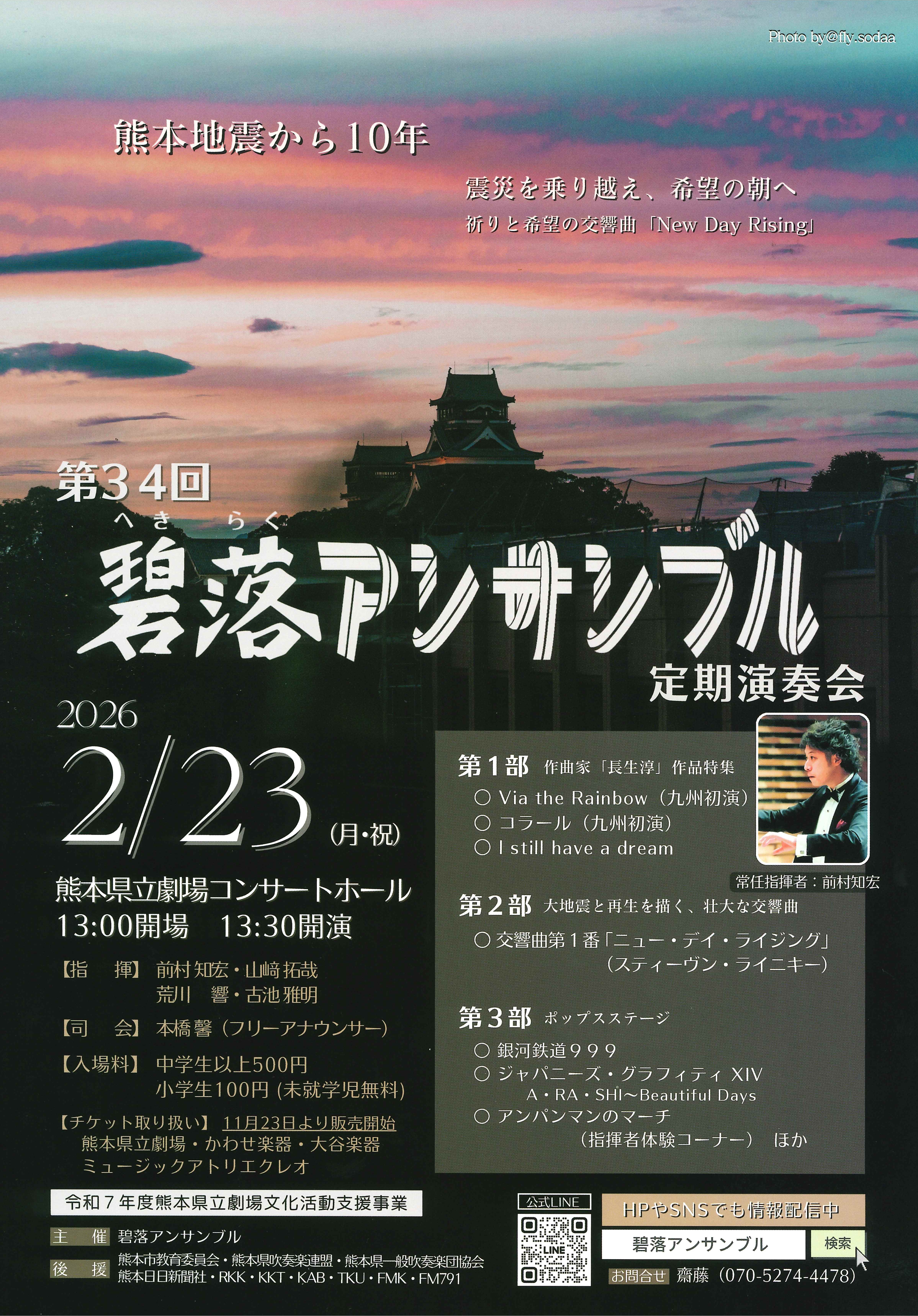 熊本地震から10年を迎え「震災を乗り越え、希望の朝へ」をテーマに掲げて、第2部では祈りと希望の交響曲「ニュー・デイ・ライジング」を演奏します。 第1部では味わい深い長生淳の吹奏楽オリジナル作品たちを、第3部では吹奏楽にあまり詳しくない方でも楽しめるポップス曲を演奏します。 お子さまも楽しめる指揮者体験コーナーも実施予定です。 |