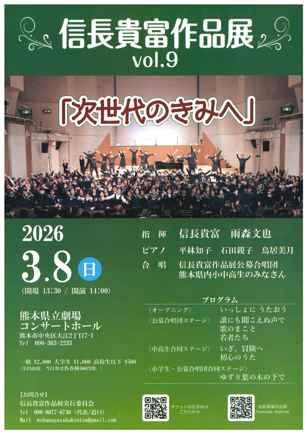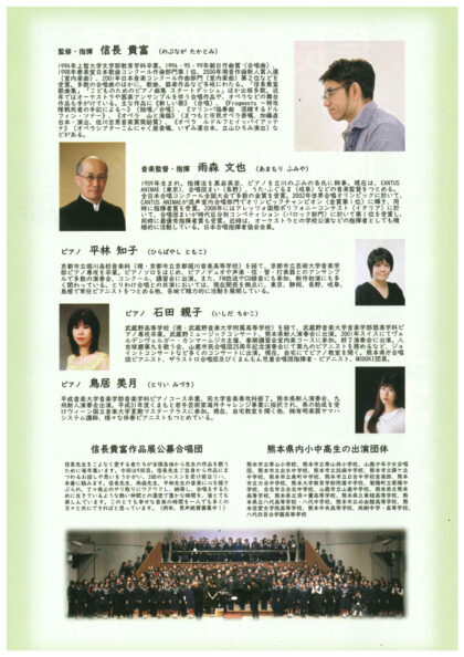 指揮/信長貴富、雨森文也 ピアノ/平林知子、石田親子、鳥居美月 合唱/信長貴富作品展公募合唱団、熊本県内小中高生のみなさん |