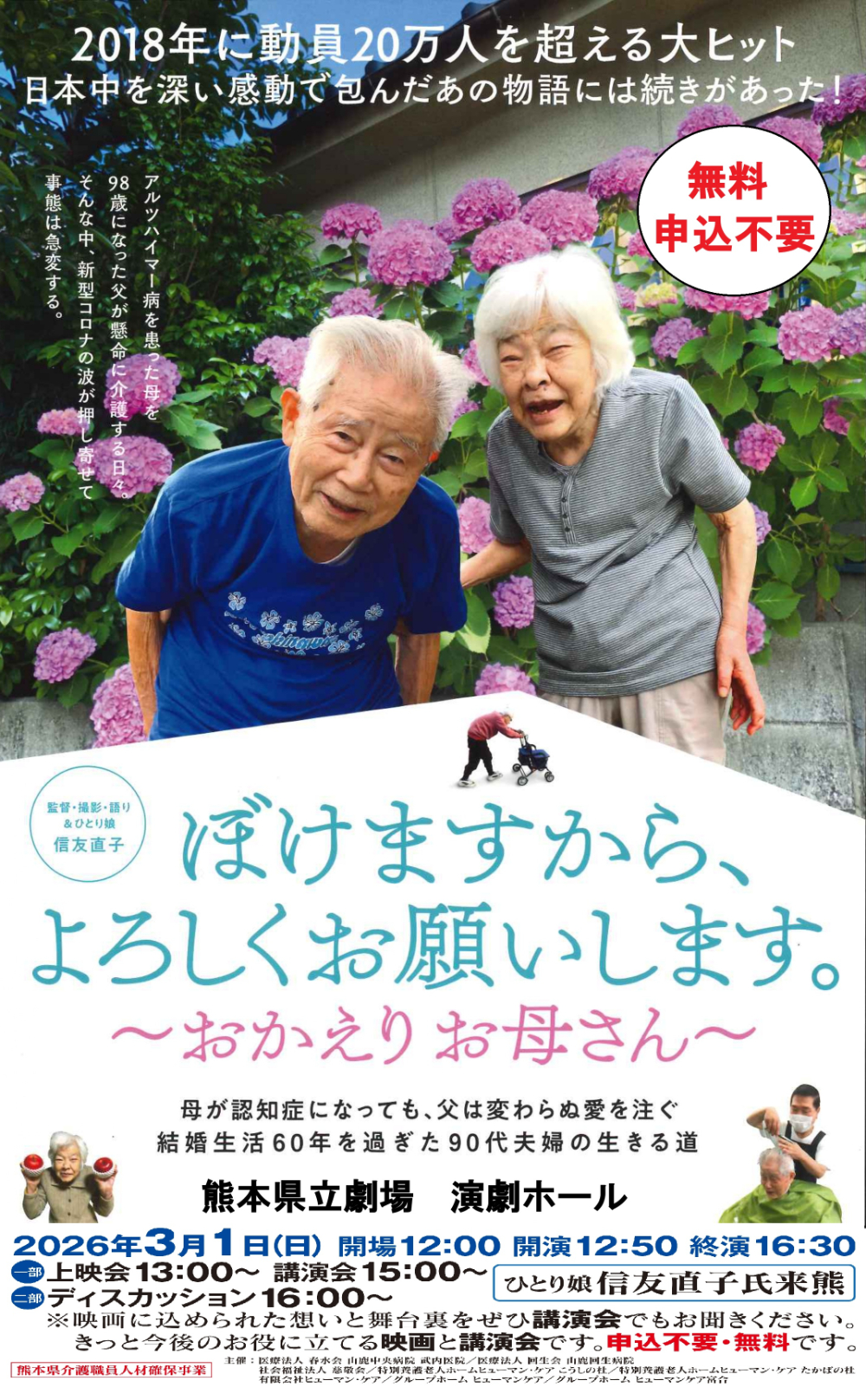 第二弾映画上映会と、監督でもあり、ひとり娘の信友直子さんの老老介護、家族介護、認知症についての講演会(映画上映+講演会)。 その後、ワークショップとして、一般参加者から在宅介護、認知症、看取りについての疑問、質問の時間を設け、会場参加者の方々と実体験談の共有を行う。 |