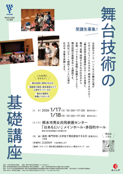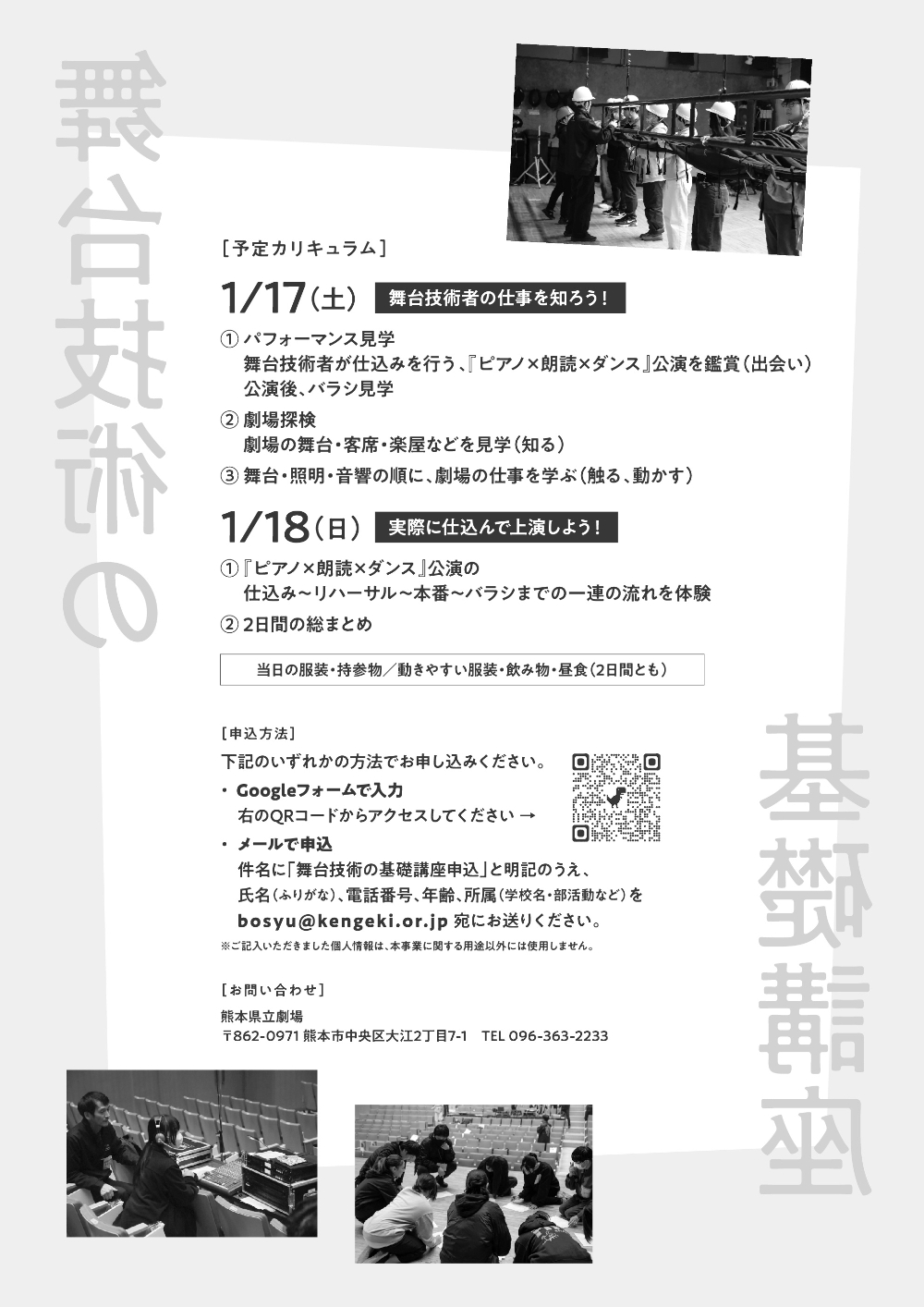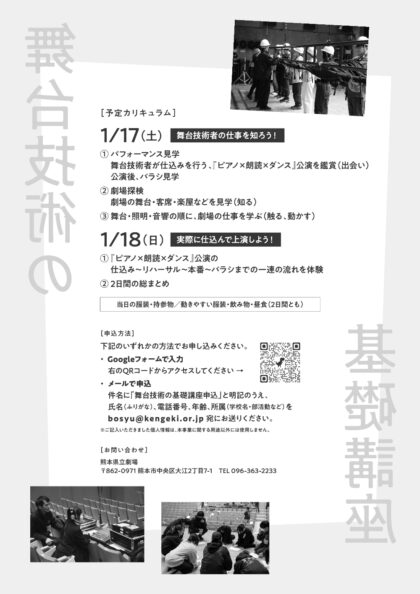 【申込方法】 件名に「舞台技術の基礎講座申込」と明記のうえ、氏名とふりがな、電話番号、年齢、所属(学校名・部活動など)と、下記①②③についての回答をお送りください。