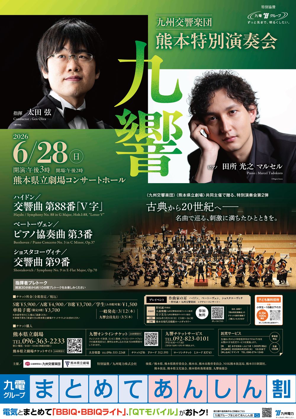 熊本県立劇場と九州交響楽団による包括連携協定締結後の共同主催事業第4弾は、常任指揮者・太田弦によるハイドン、ベートーヴェン、ショスタコーヴィチ。 ピアノ・田所光之マルセルとの協奏曲は必聴です。 古典から20世紀へ——名曲で巡る、刺激に満ちたひとときをぜひ、劇場で。 |